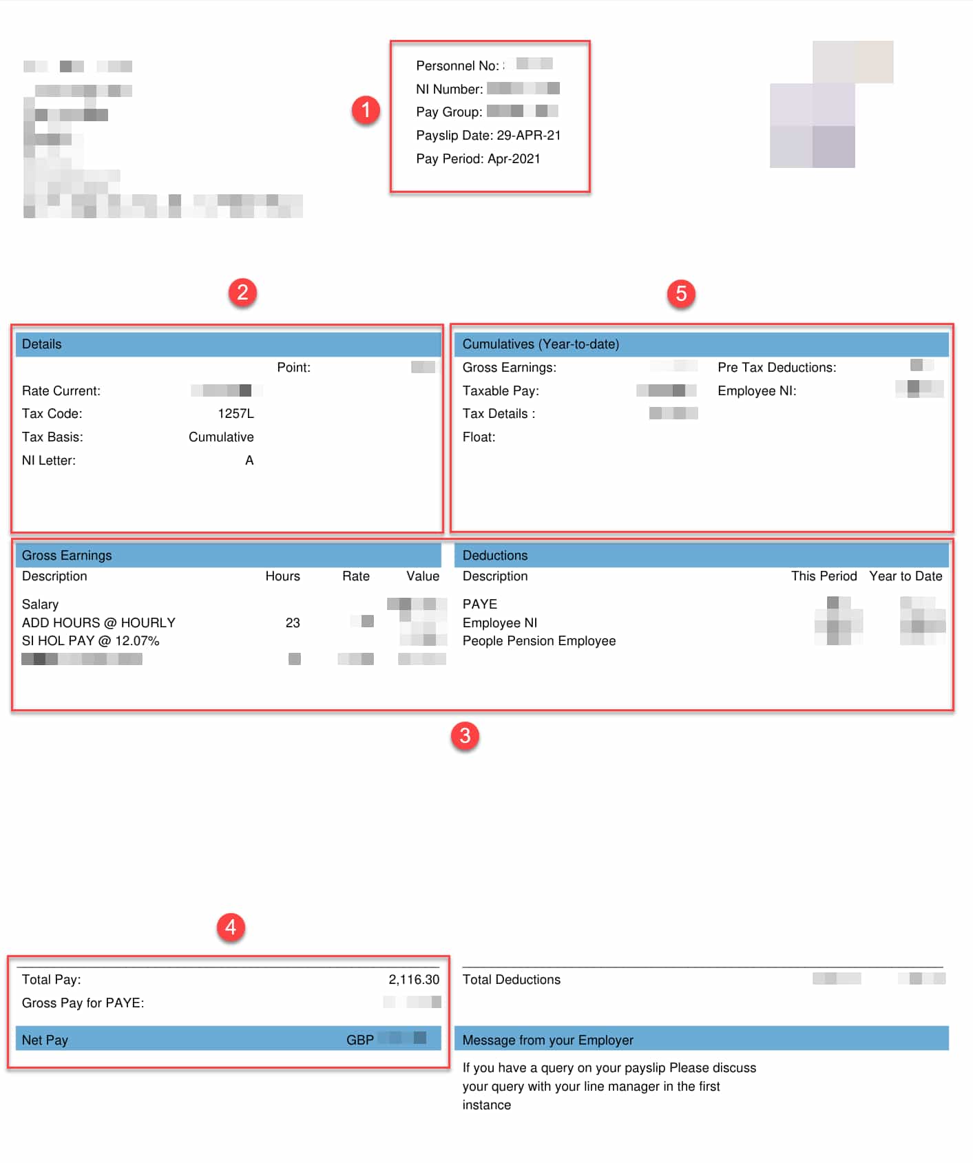 Your payslip might look different from your friend’s, but they all must show the same basic information. Seeing a real example makes things much clearer. Below is a real, anonymised UK payslip. We have numbered the main sections to help you understand what each part means.